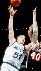 2003: Signed with Orlando Magic as an unrestricted free agent. 2001-02 Utah Stats: 12.6 PPG, 6.3 Rebs MWC Coaches Player of the Year 2001-02 Member of NIT All-Stars Touring Team, Summer 2002 Top-50 Candidate for Wooden Award 2002-03 First Team McDonalds All American (High School) First Team Basketball Weekly All American (High School) Excerpt from the Magic-Cavs summer league game on July 8, 2003: Orlando’s Britton Johnsen brought the crowd to its feet midway through the third quarter, stealing a pass from LeBron James at midcourt, racing down the floor, then dunking on the 6-8 rookie with his right hand. Johnsen, a 6-10 forward from the University of Utah, scored 10 points for the Magic. |